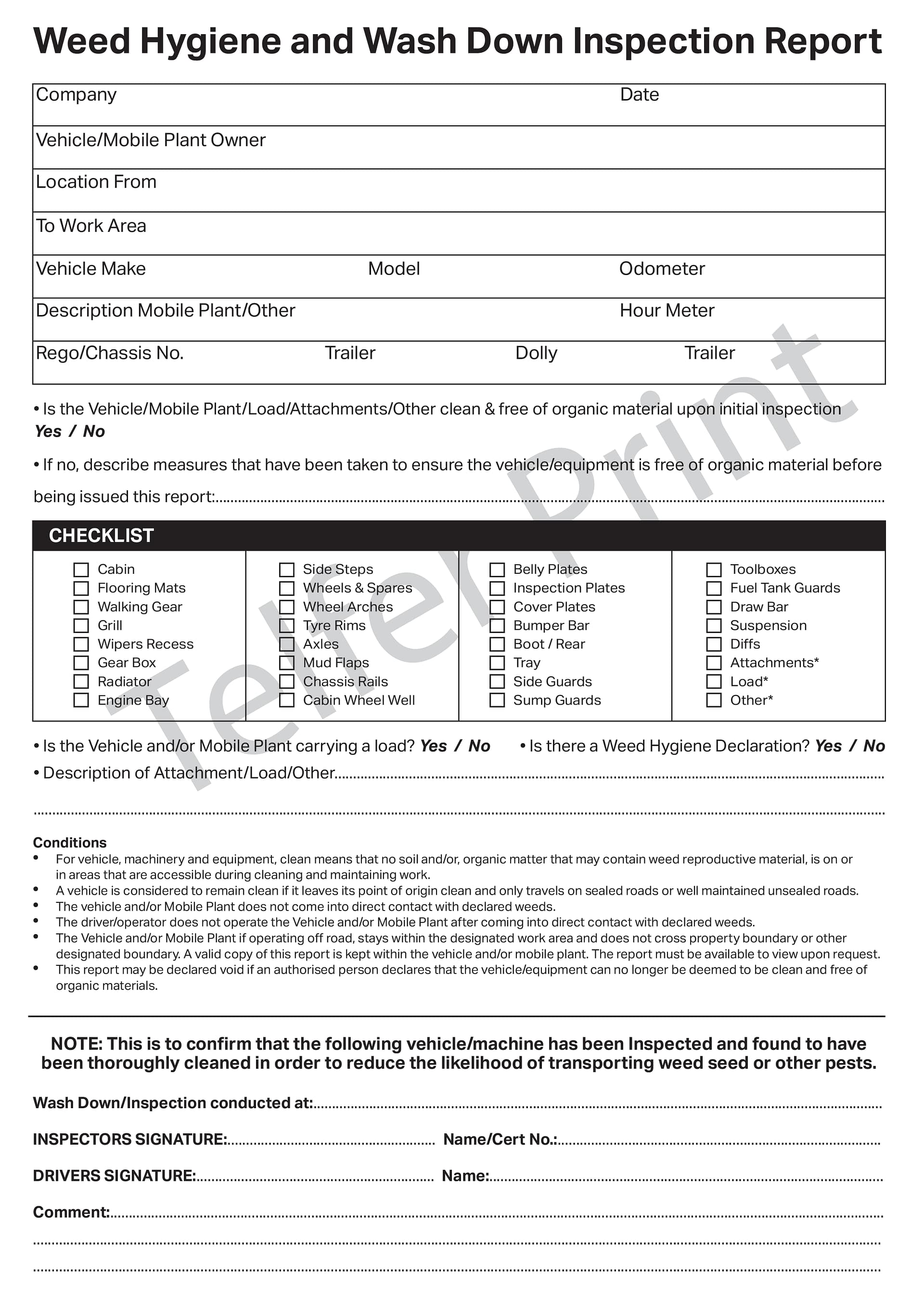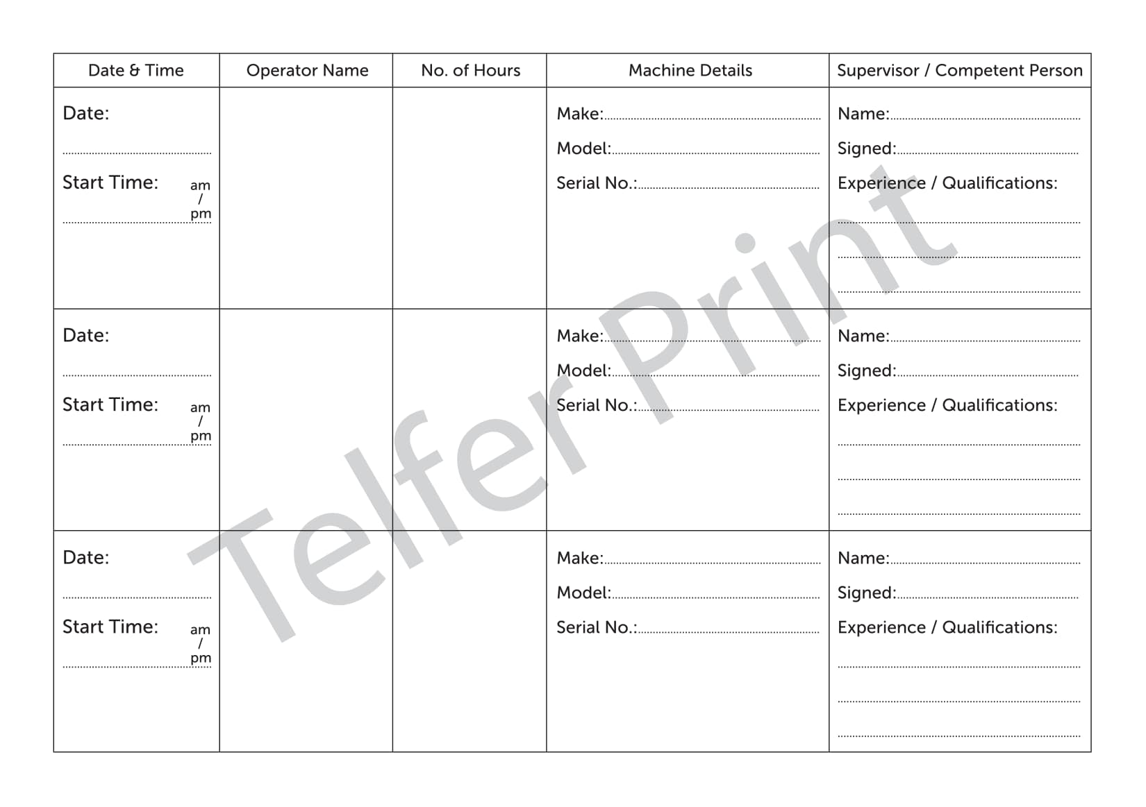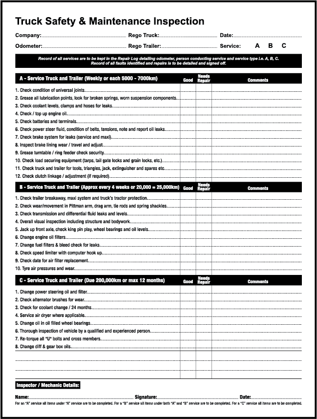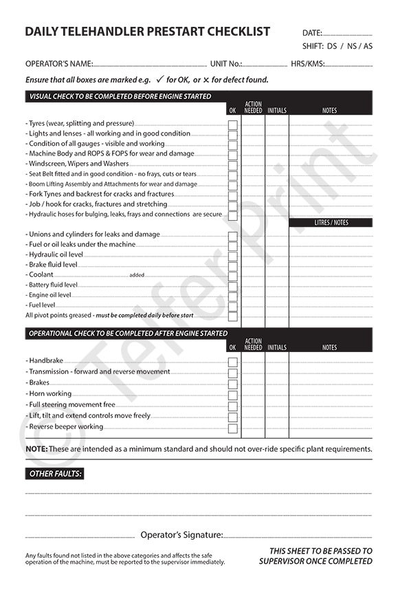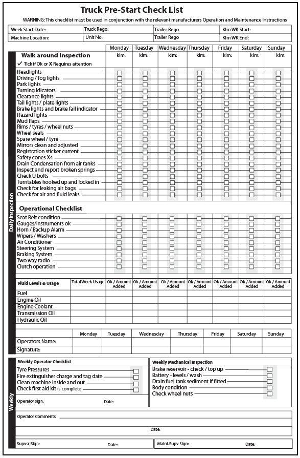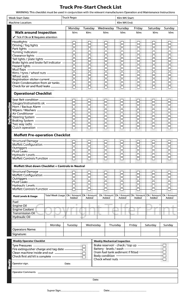 • Format: Weekly — daily checks signed by operator; duplicate as service feedback form